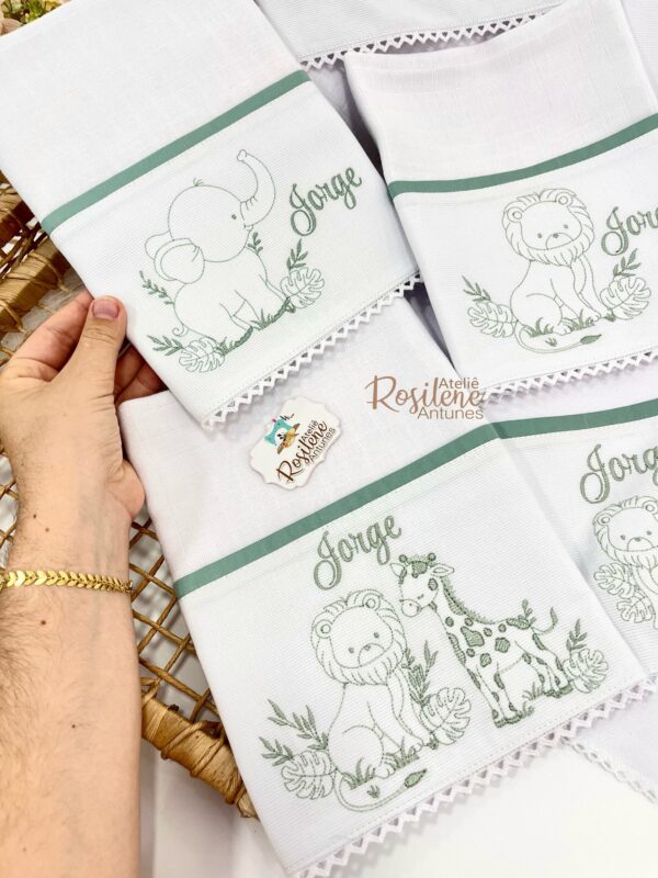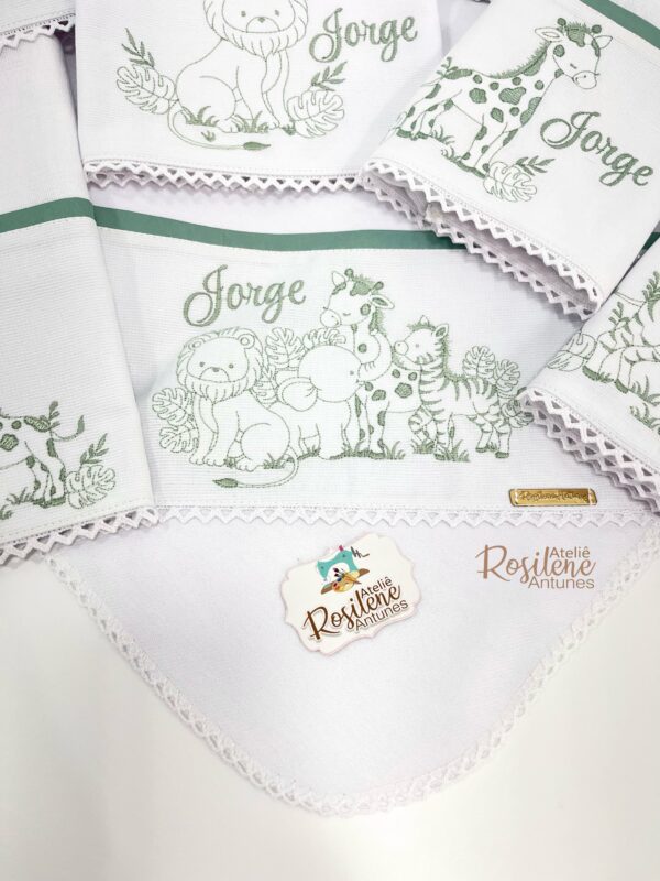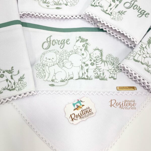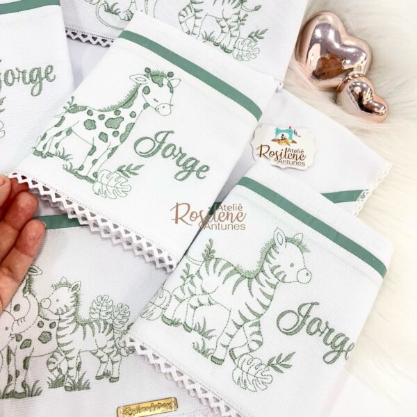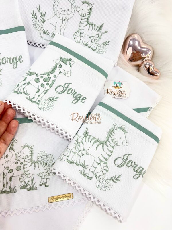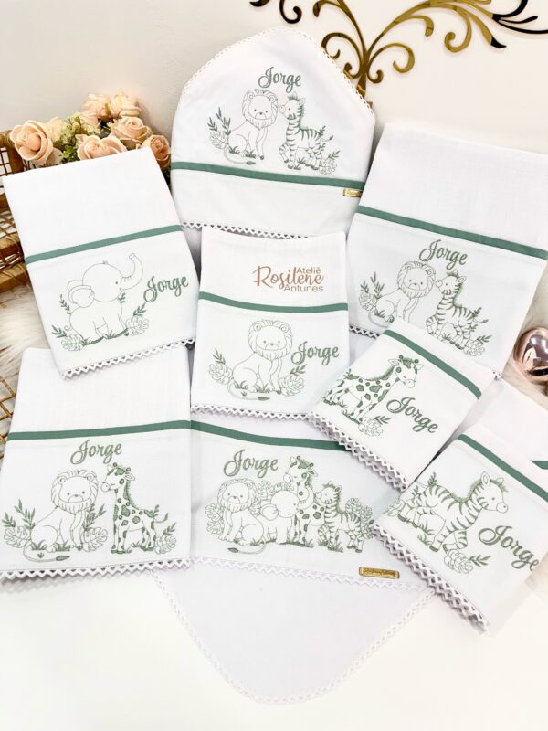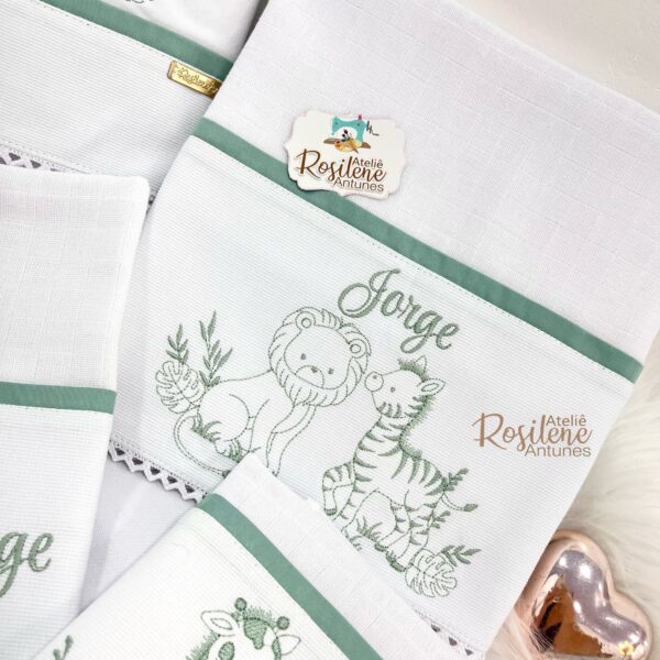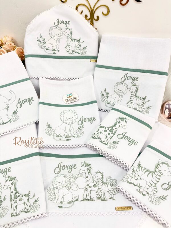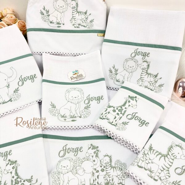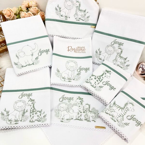 Oferecemos uma seleção de kits já montados como este , que servem como inspirações para o seu enxoval. Você pode optar por manter o tema escolhido ou personalizar de acordo com o seu gosto. Sinta-se à vontade para trocar o tema, as cores e adicionar o nome do seu bebê, tornando cada item verdadeiramente único e especial.
