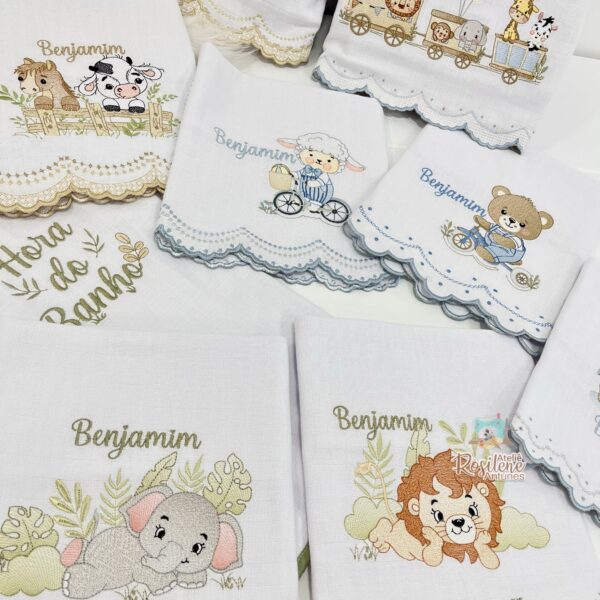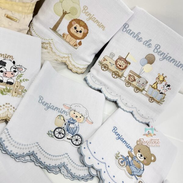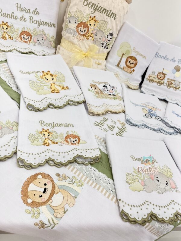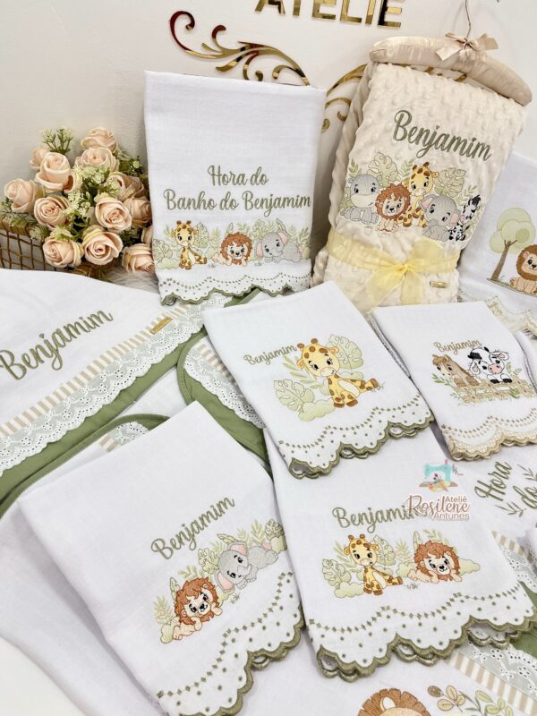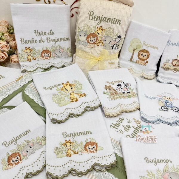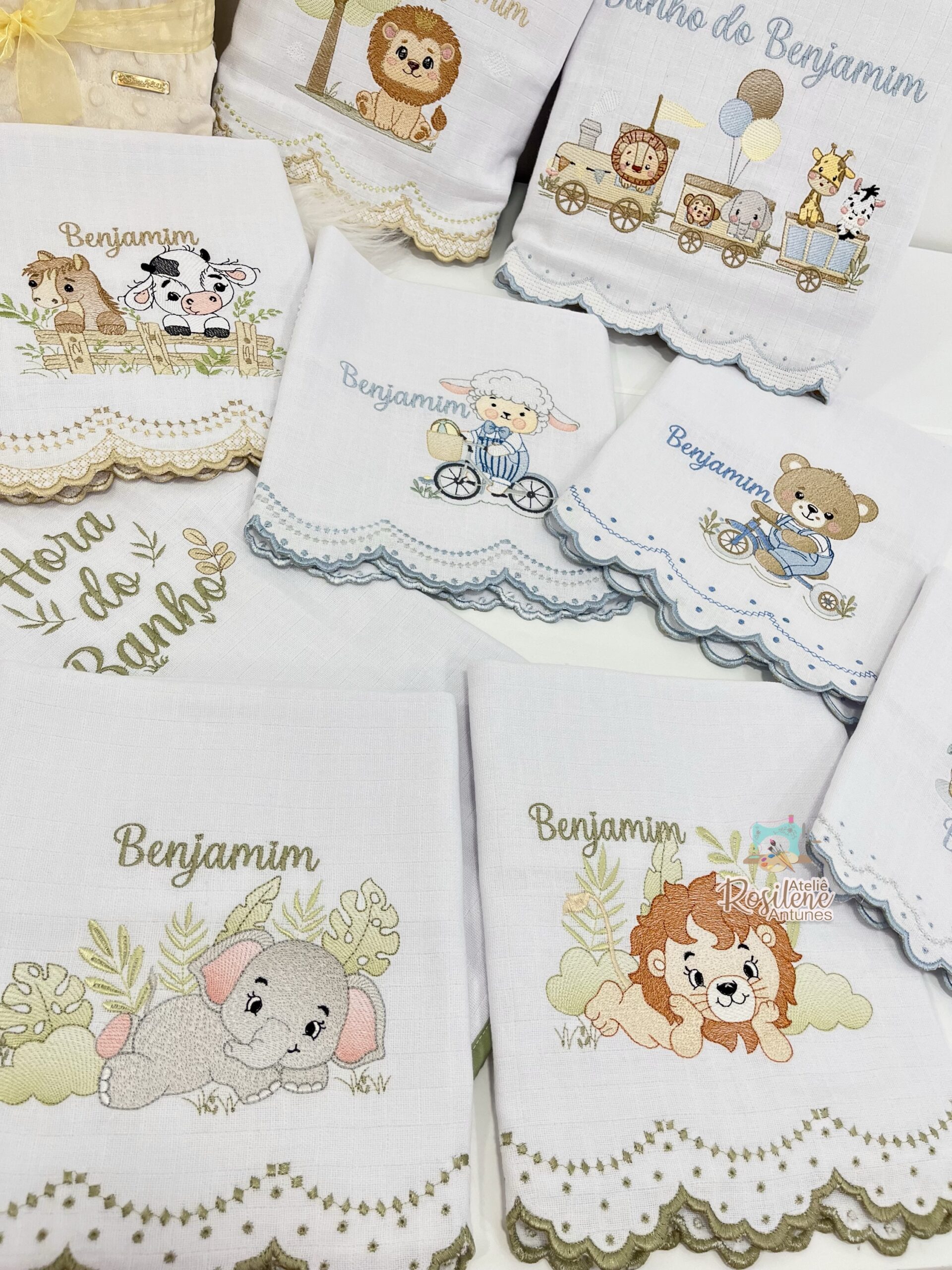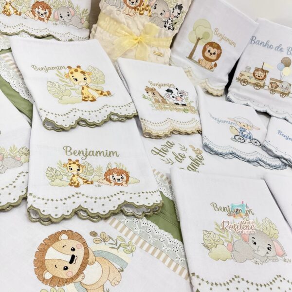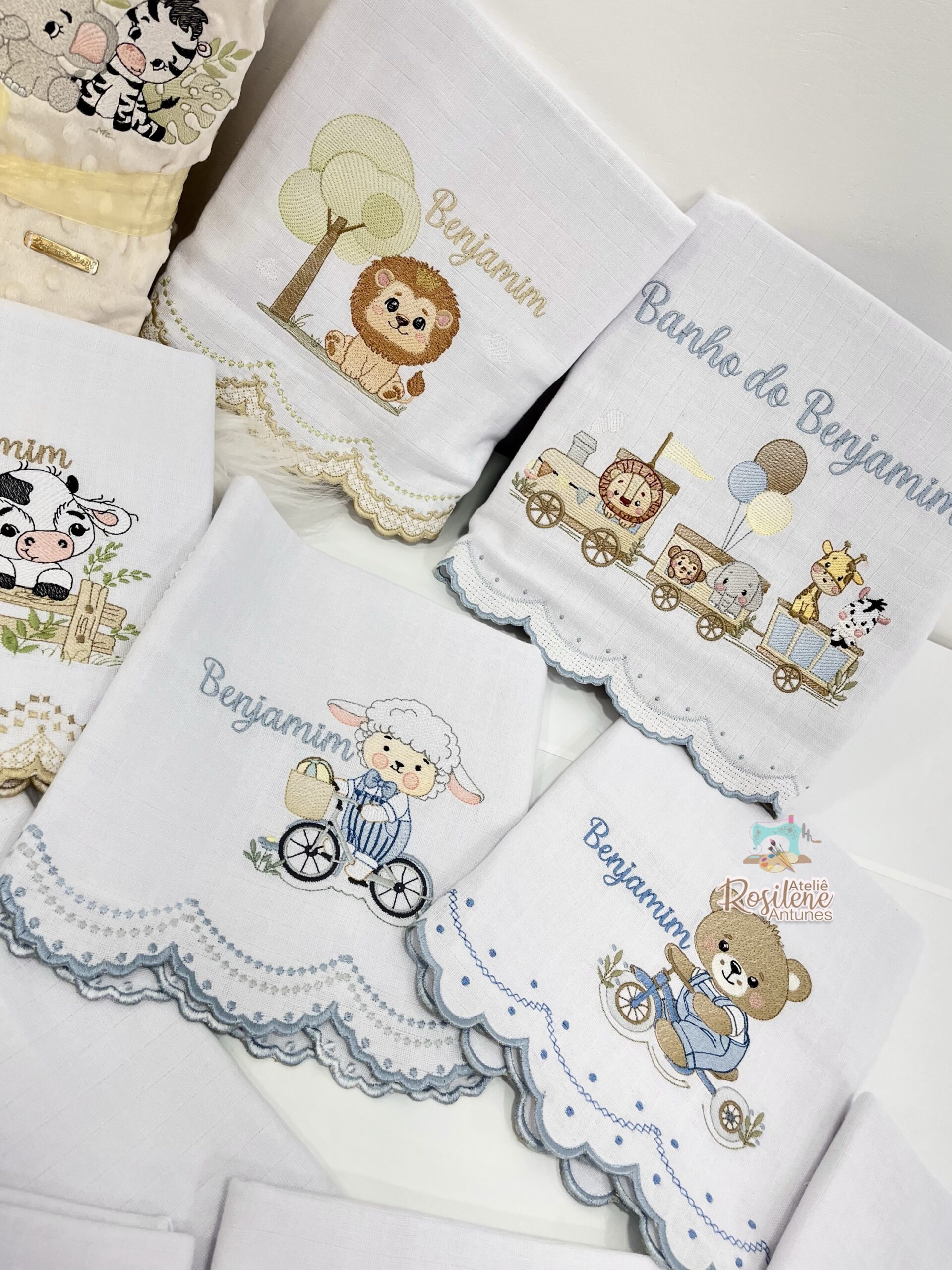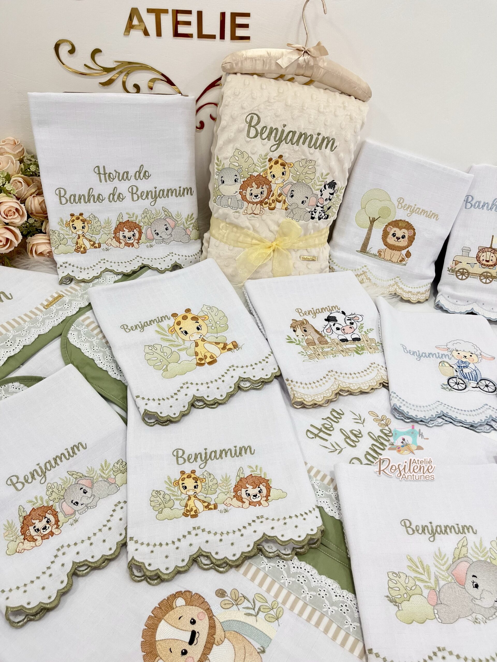 Oferecemos uma seleção de kits já montados como este , que servem como inspirações para o seu enxoval. Você pode optar por manter o tema escolhido ou personalizar de acordo com o seu gosto. Sinta-se à vontade para trocar o tema, as cores e adicionar o nome do seu bebê, tornando cada item verdadeiramente único e especial.