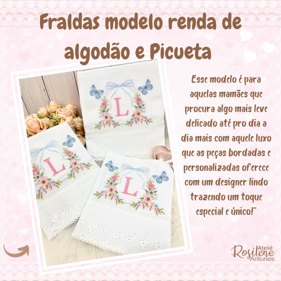 Bordada direto na fralda acabamento em picueta e renda.