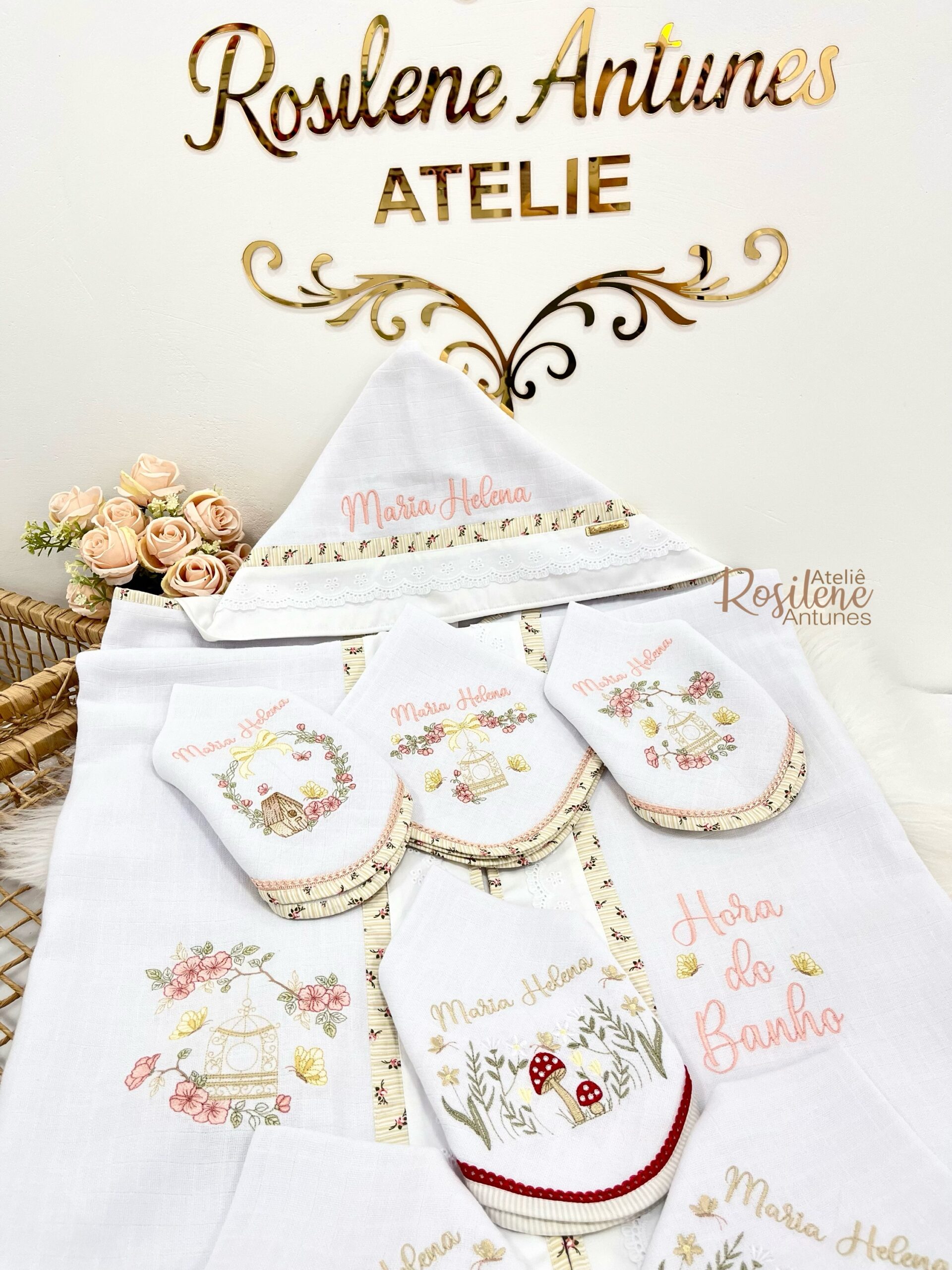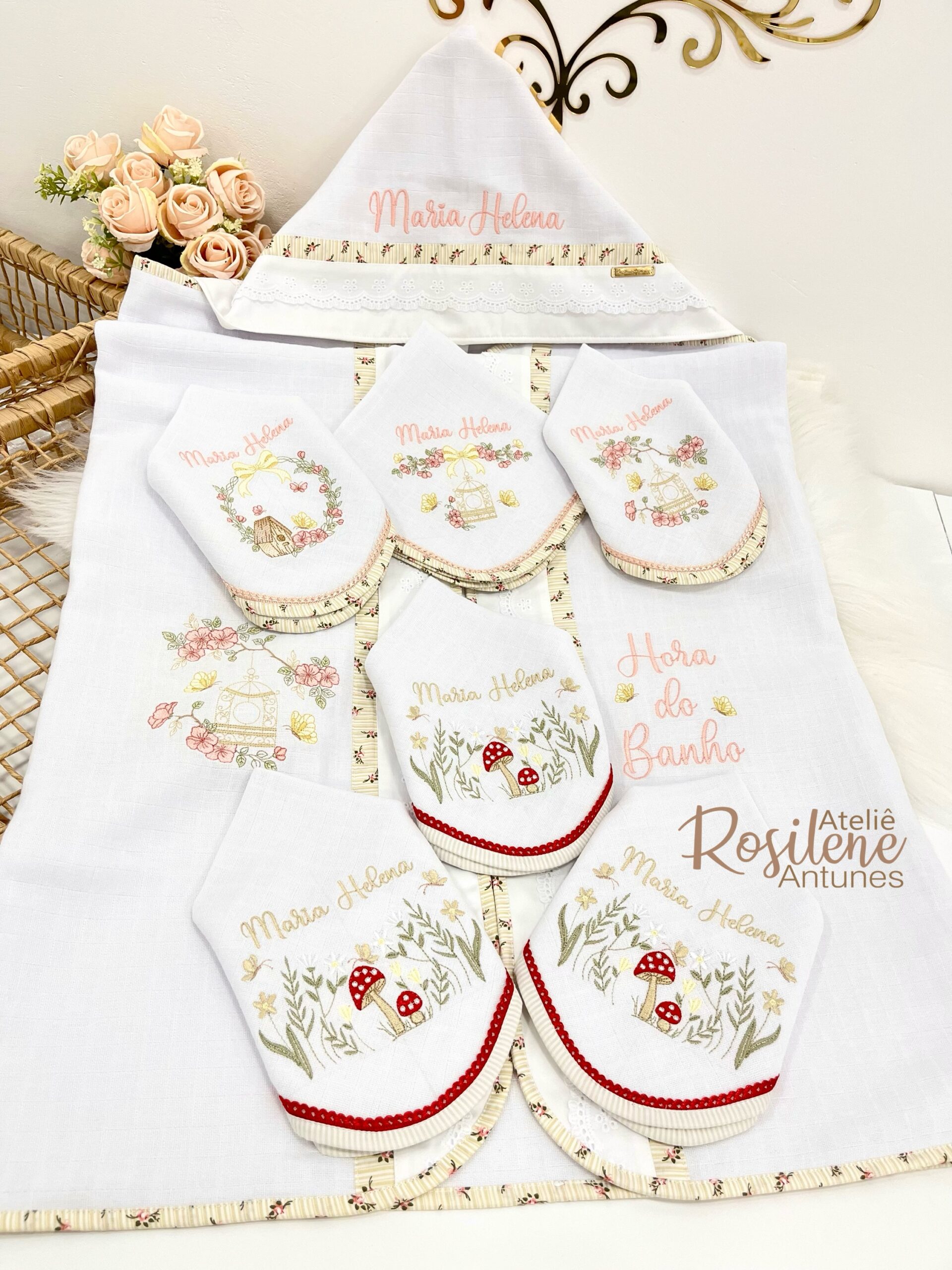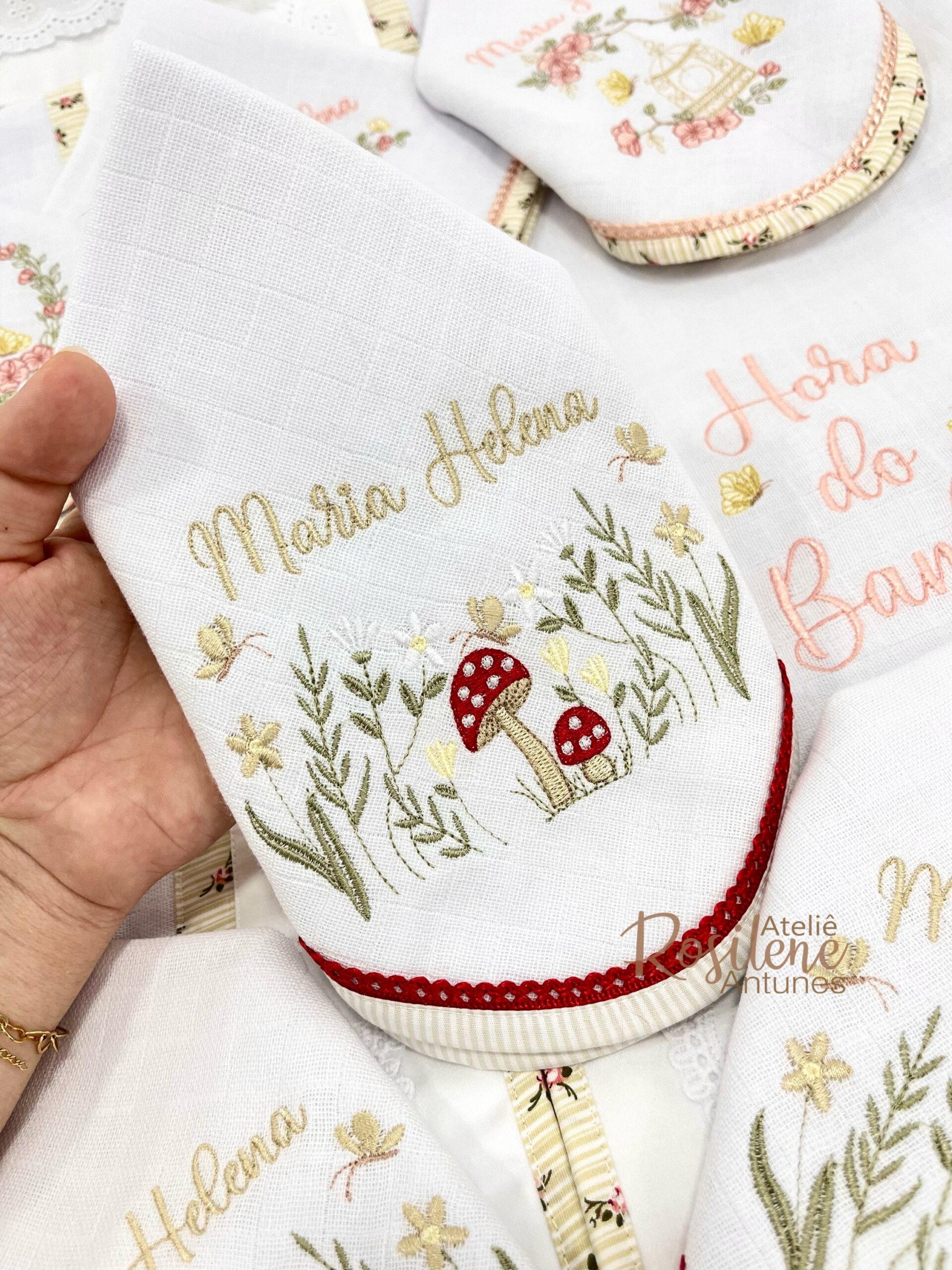 Oferecemos uma seleção de kits já montados como este , que servem como inspirações para o seu enxoval. Você pode optar por manter o tema escolhido ou personalizar de acordo com o seu gosto. Sinta-se à vontade para trocar o tema, as cores e adicionar o nome do seu bebê, tornando cada item verdadeiramente único e especial.