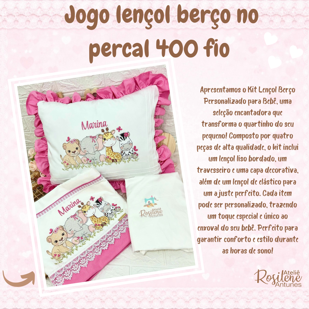 Cada peça é confeccionada com materiais de alta qualidade percal 400 fio e tricoline , garantindo durabilidade e fácil lavagem. Escolha o Kit Lençol de Berço Personalizado e ofereça ao seu bebê um espaço cheio de amor e estilo!