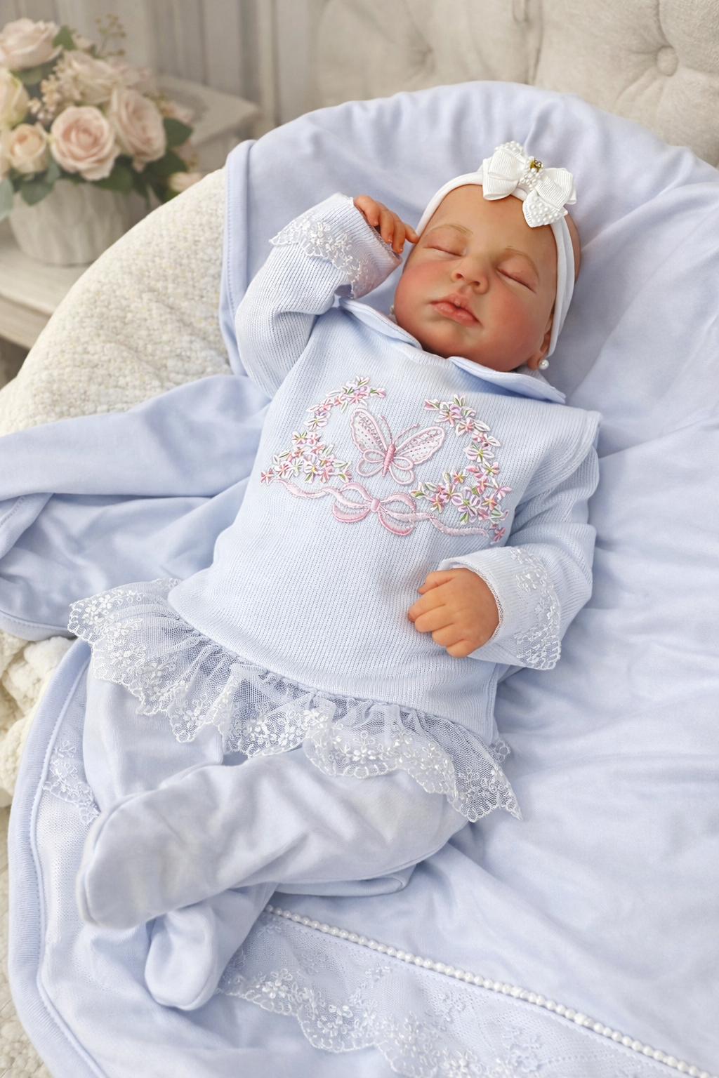 Apresentamos a delicada saída maternidade confeccionada em malha suedine de 100% algodão, perfeita para todas as estações.