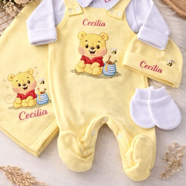 O conjunto inclui uma manta macia, jardineira, body, toca e luvas, garantindo que seu bebê esteja sempre aquecido e elegante.