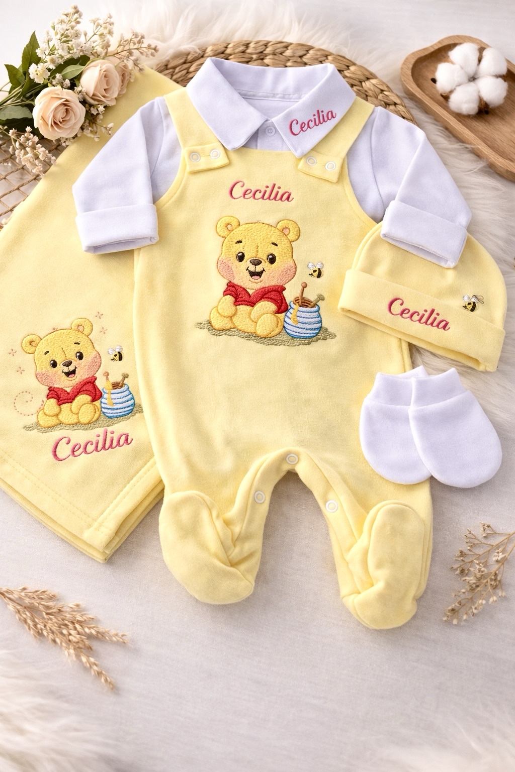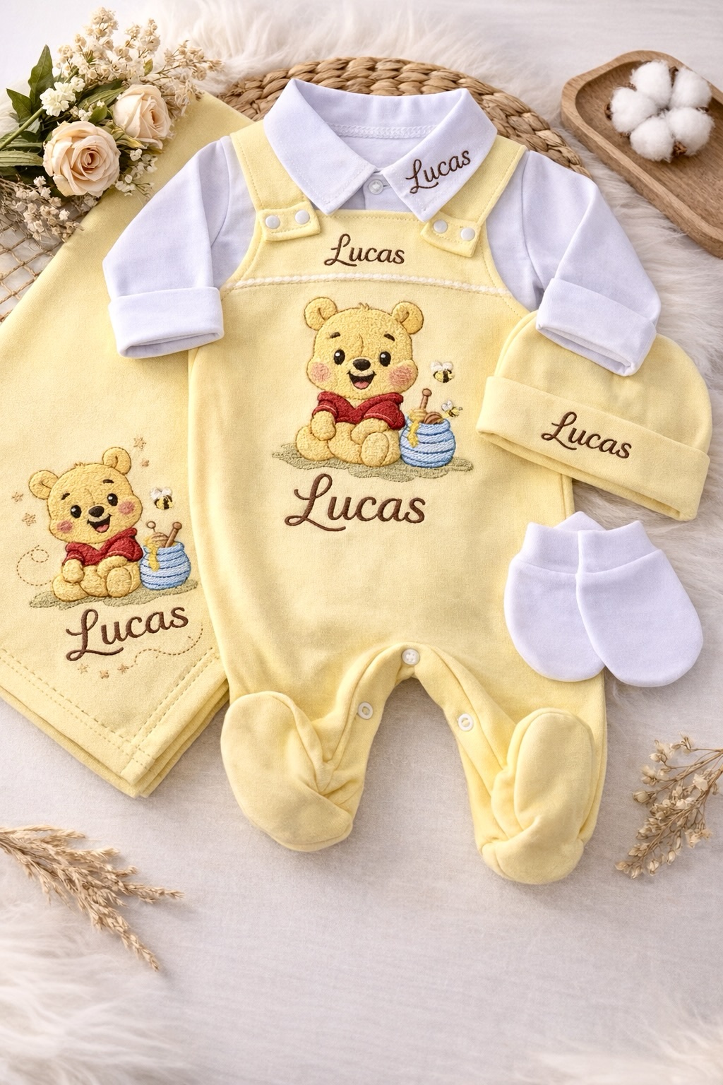 O conjunto inclui uma manta macia, jardineira, body, toca e luvas, garantindo que seu bebê esteja sempre aquecido e elegante.