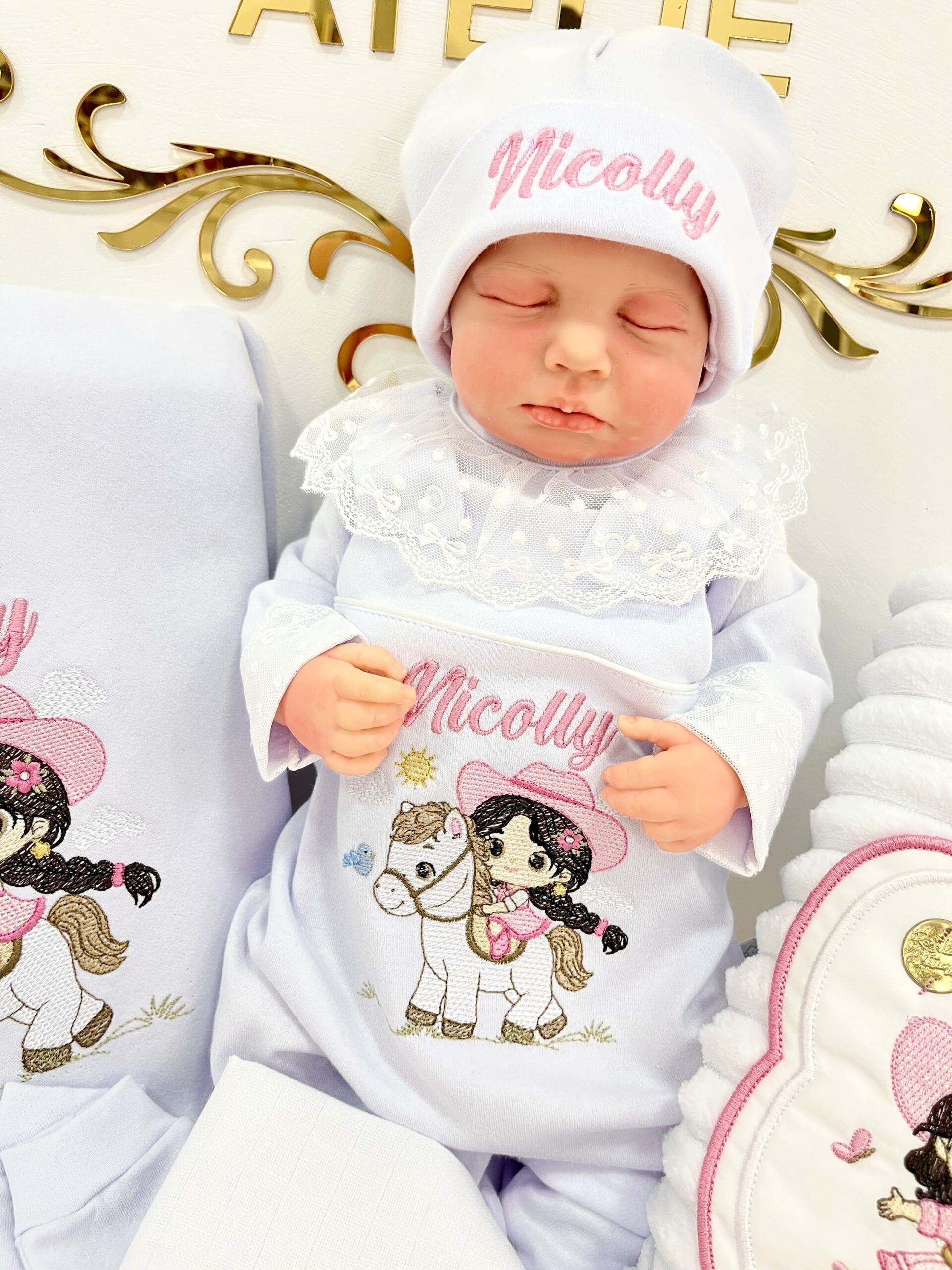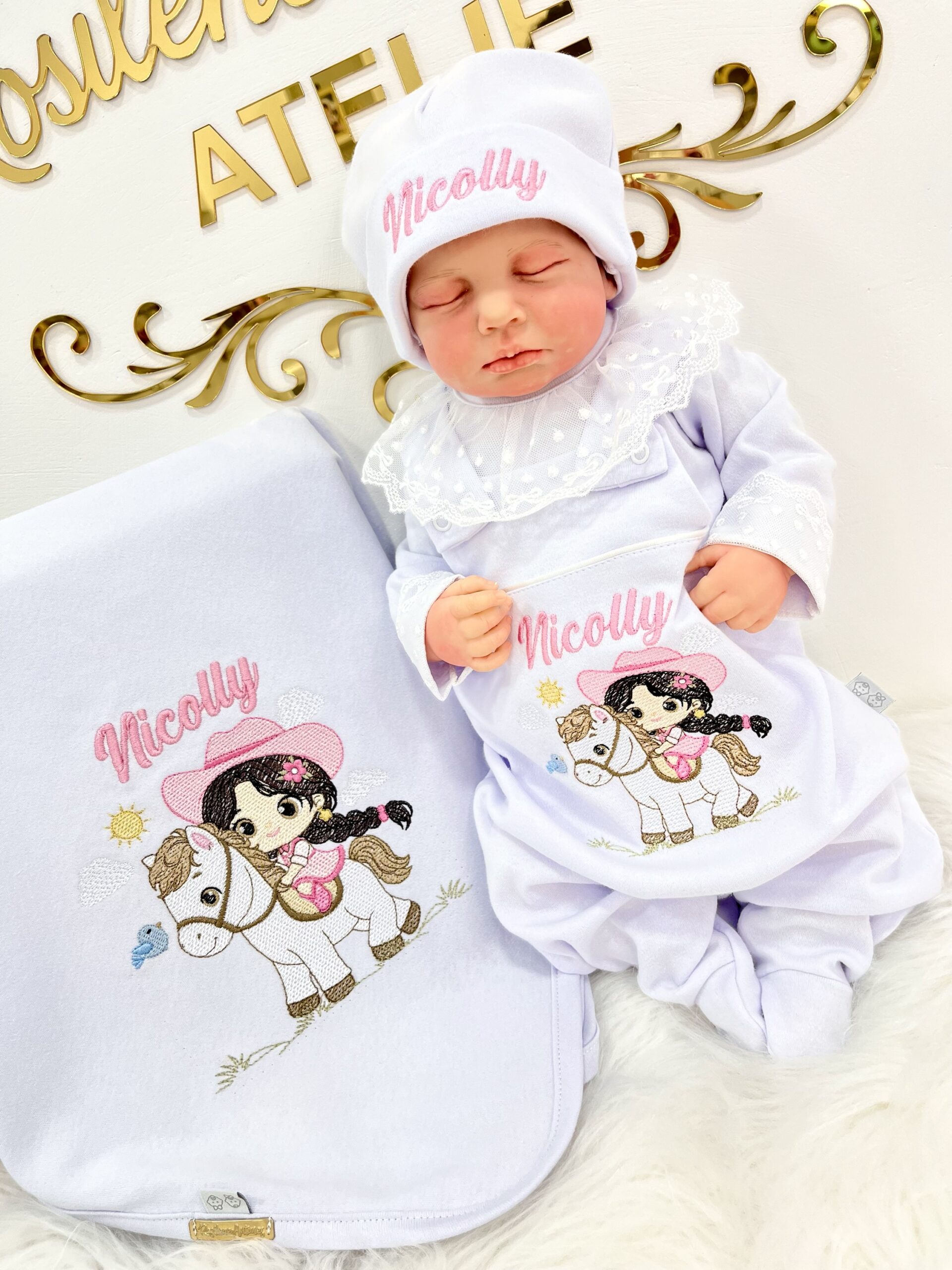 Cada saída maternidade é personalizada com o nome e o tema escolhido pela mamãe, tornando esse momento ainda mais especial.