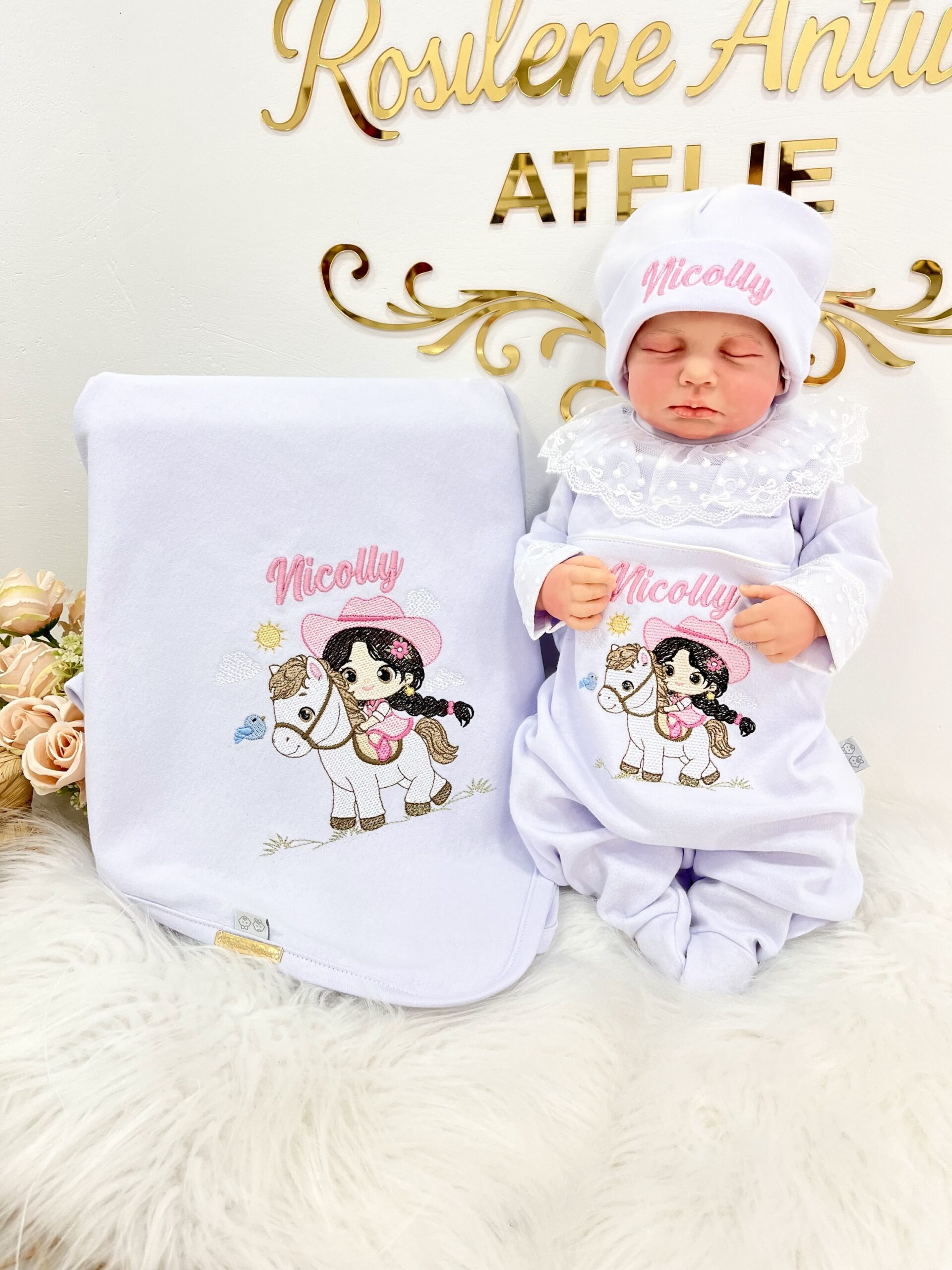 O conjunto inclui uma manta macia, jardineira, body, toca e luvas, garantindo que seu bebê esteja sempre aquecido e elegante.