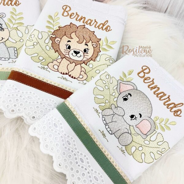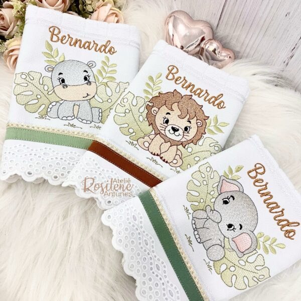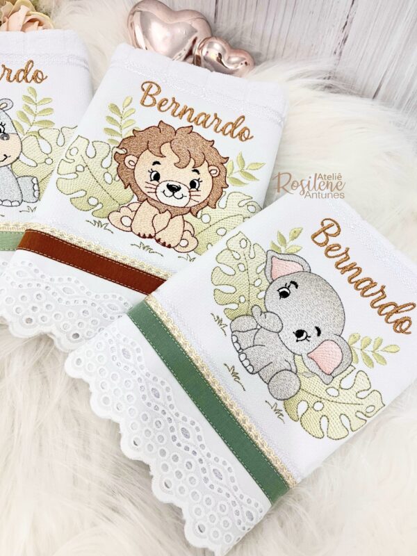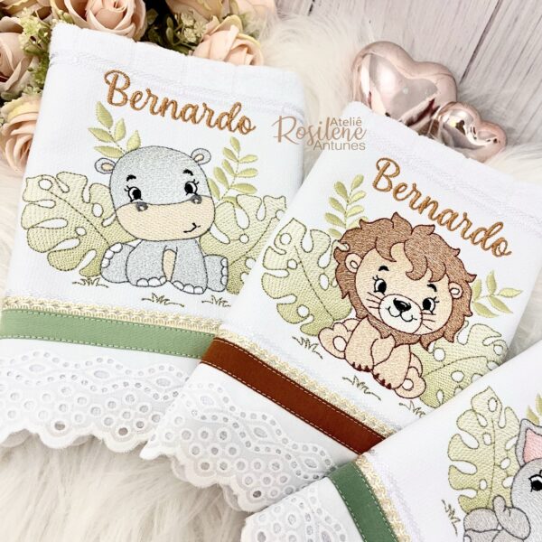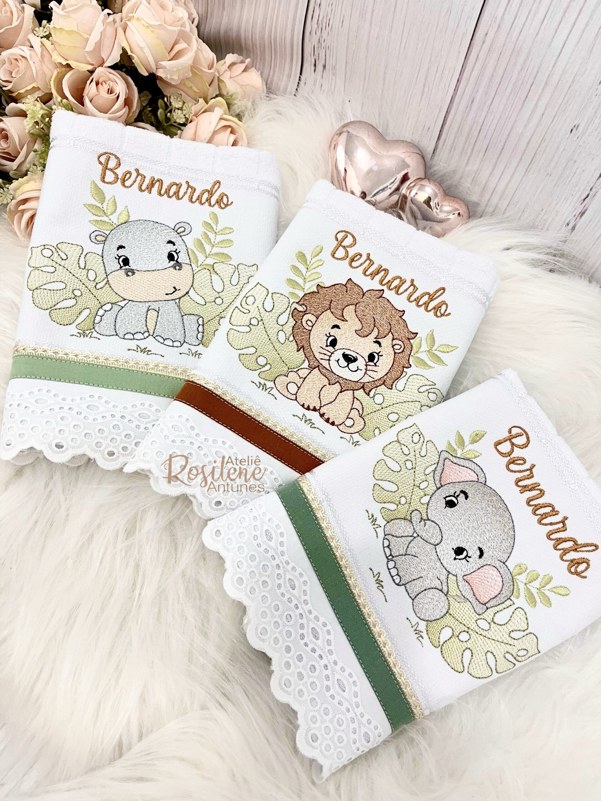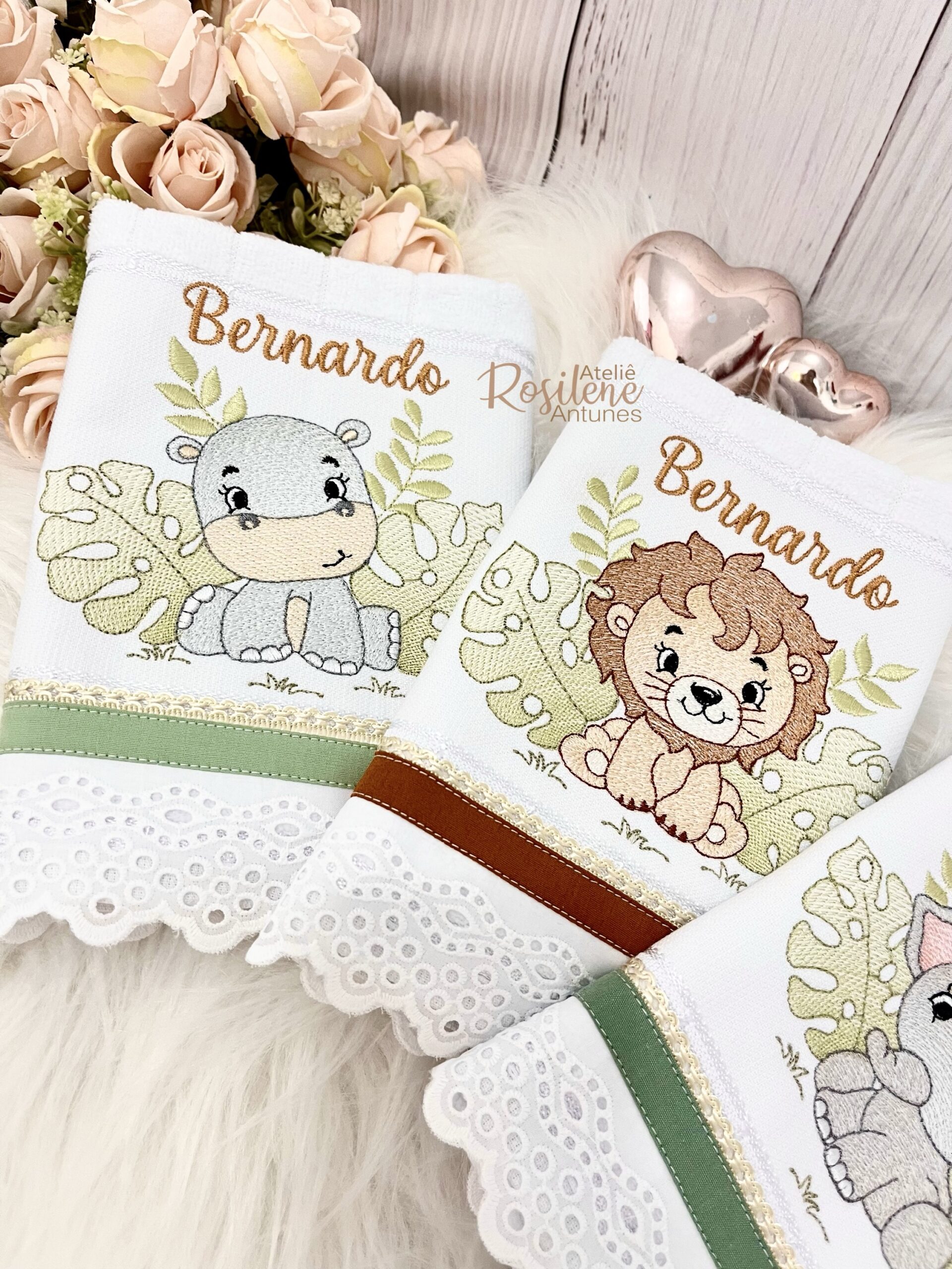 A personalização permite que você escolha entre diversas estampas e cores, além de adicionar o nome ou iniciais da criança, tornando cada toalhinha única e especial.